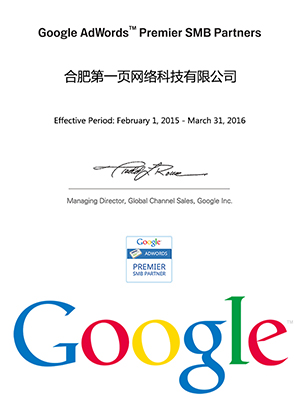 ★2015年2月11日,第一頁網(wǎng)絡(luò)科技正式成為Google中國區(qū)核心合作伙伴。第一頁網(wǎng)絡(luò)科技擁有了全球最大的搜索引擎Google授予的Google全球推廣資源,來幫助第一頁的客戶整合更專業(yè)、更全面、更高效的外貿(mào)營銷推廣方案。