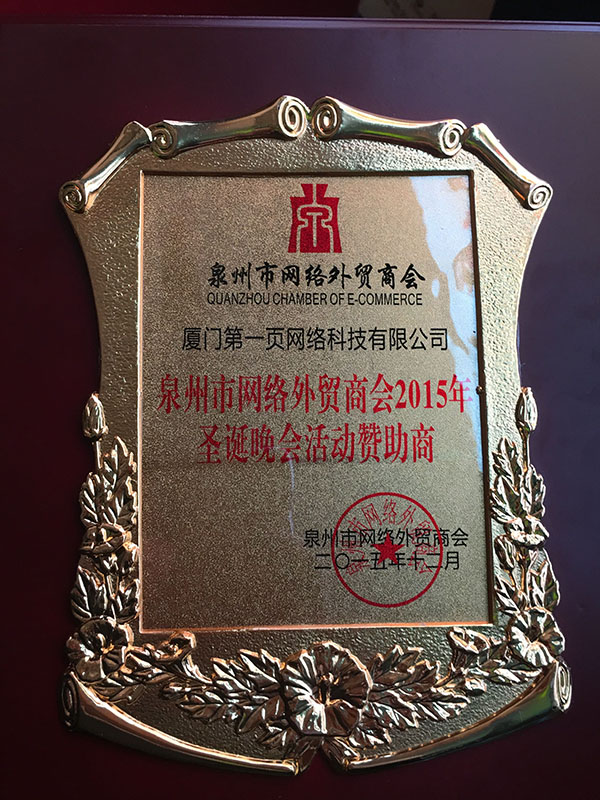 泉州市網(wǎng)絡(luò)外貿(mào)商會(huì)為第一頁網(wǎng)絡(luò)科技頒發(fā)的活動(dòng)贊助商證書