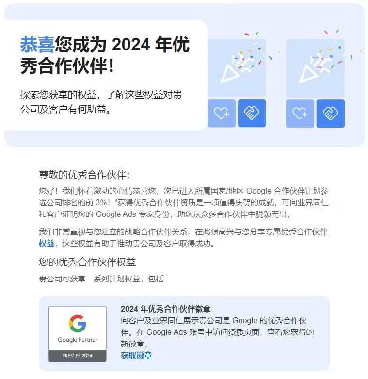 這次再次獲得谷歌2024年度的認(rèn)可,不僅證明了谷歌對(duì)第一頁業(yè)務(wù)的高度認(rèn)可,也意味著第一頁將繼續(xù)接收來自谷歌官方Google Ads領(lǐng)域最新的專業(yè)知識(shí),以更好地為客戶提供服務(wù)。
