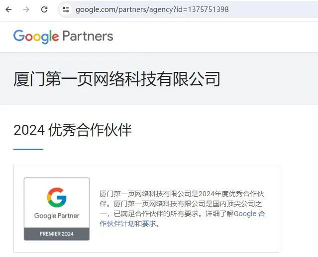 2024年2月,廈門第一頁網(wǎng)絡(luò)科技有限公司榮幸地成為谷歌2024年度的"優(yōu)秀合作伙伴"之一。